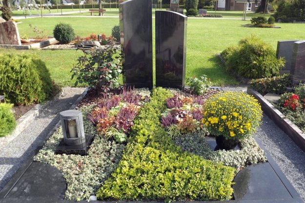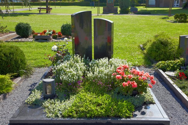 Mit seiner Blütenfülle setzt ein Wechselbeet einen farblichen Grabakzent. Die bunten Blumen sind ebenso Symbole des Lebens wie des Trostes.